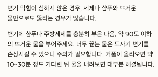 변기에 샴푸나 주방세제를 충분히 부은 다음, 약 90도 이하의 뜨거운 물을 부어주세요. 너무 끓는 물은 도자기 변기를 손상시킬 수 있으니 주의가 필요합니다. 거품이 올라오면 약 10~30분 정도 기다린 뒤 물을 내려보면 대부분 해결됩니다.