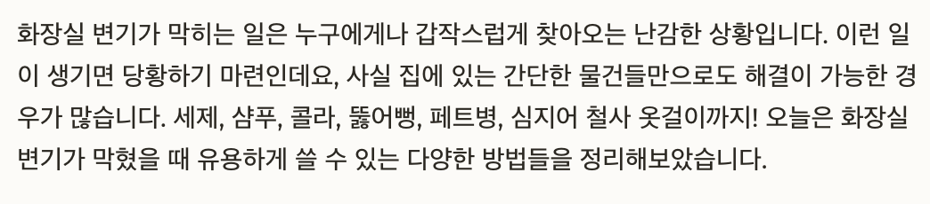 화장실 변기가 막히는 일은 누구에게나 갑작스럽게 찾아오는 난감한 상황입니다. 이런 일이 생기면 당황하기 마련인데요, 사실 집에 있는 간단한 물건들만으로도 해결이 가능한 경우가 많습니다. 세제, 샴푸, 콜라, 뚫어뻥, 페트병, 심지어 철사 옷걸이까지! 오늘은 화장실 변기가 막혔을 때 유용하게 쓸 수 있는 다양한 방법들을 정리해보았습니다.
