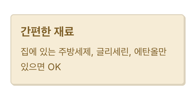 이 조합은 에탄올이 찌든 단백질과 기름기를 녹이고, 주방세제가 때를 분리하며, 글리세린이 섬유 손상을 막아줍니다.