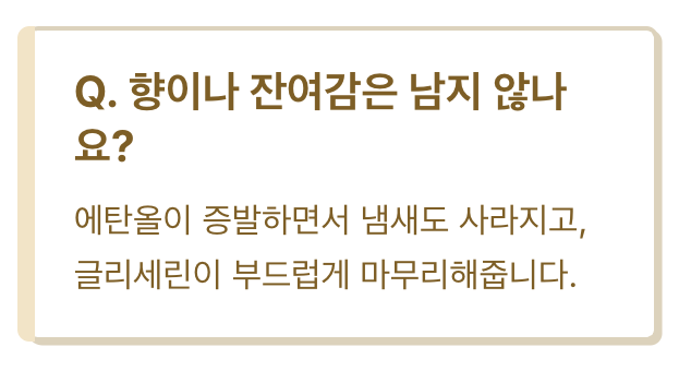 A. 에탄올이 증발하면서 냄새도 사라지고, 글리세린이 부드럽게 마무리해 줍니다.