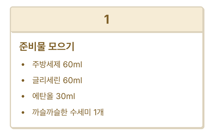 - 빈 통에 주방세제, 글리세린, 에탄올을 2:2:1 비율로 넣습니다.