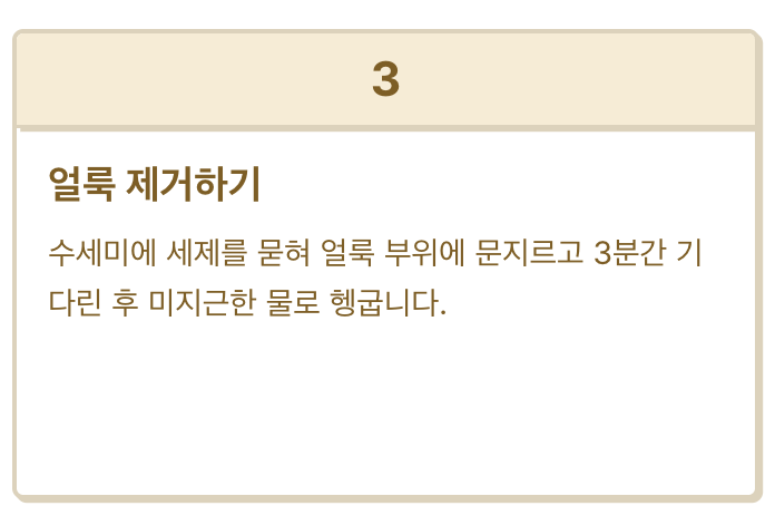 - 수세미에 세제를 묻혀 얼룩 부위에 문지르고 3분간 기다린 후 미지근한 물로 헹굽니다.