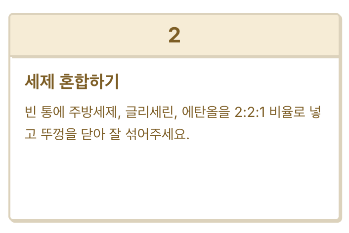 - 빈 통에 주방세제, 글리세린, 에탄올을 2:2:1 비율로 넣습니다.