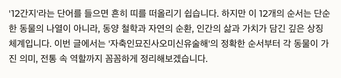 “자축인묘진사오미신유술해”는 외우기 어려운 낱말의 나열이 아니라, 인생의 흐름과 자연의 시간, 인간의 성격을 압축한 상징적 순서입니다. 이 순서를 이해하는 것만으로도 우리 전통 문화에 대한 인식이 달라질 수 있어요. 12간지는 여전히 우리 곁에 살아 숨 쉬고 있는 지혜의 언어입니다.
