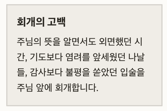 회개 개인의 이기심, 불순종, 믿음의 연약함 고백