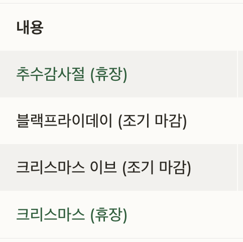 | 11월 | 28일 | 블랙프라이데이 | 조기 마감 |
