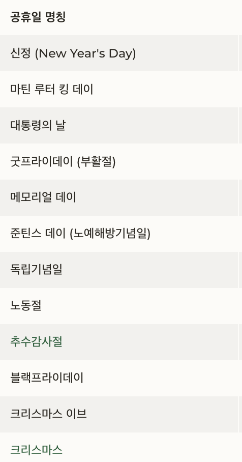 | 11월 | 27일 | 추수감사절 | 휴장 |