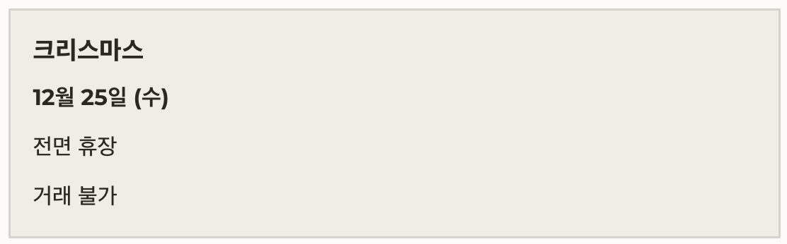 | 12월 25일 | 수 | 크리스마스 (휴장) | 거래 불가 |