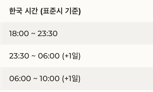 구분 시간 (ET 기준) 한국 시간 (표준시 기준)