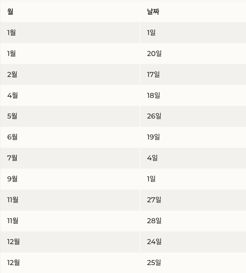 월 날짜 공휴일 명칭 비고