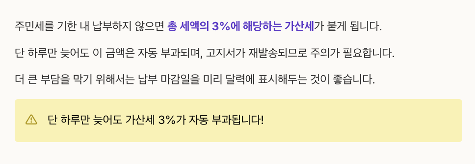 주민세를 기한 내 납부하지 않으면 총 세액의 3%에 해당하는 가산세가 붙게 됩니다.