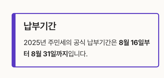 2025년 주민세의 공식 납부기간은 8월 16일부터 8월 31일까지입니다.