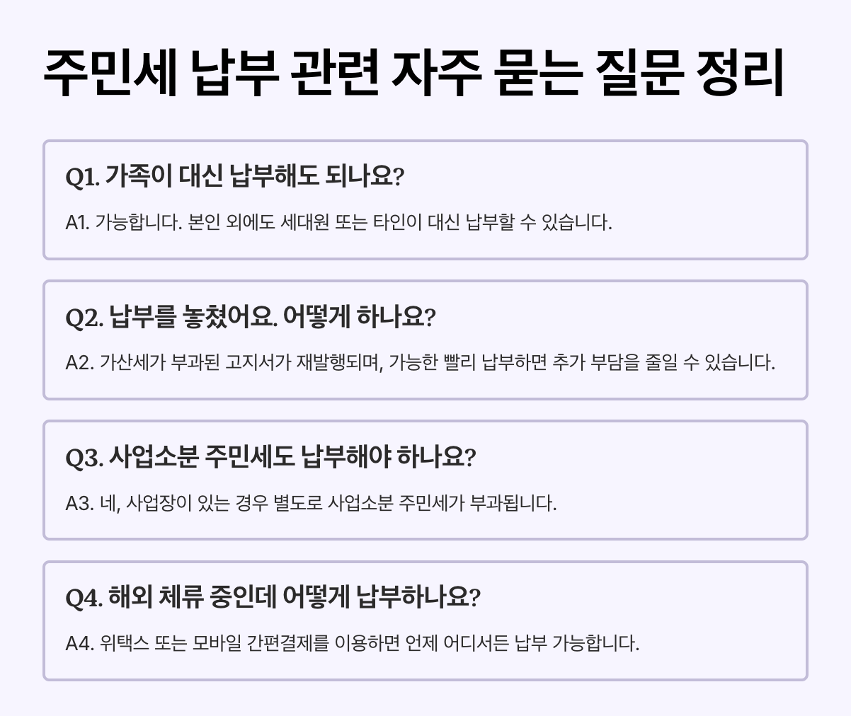 A1. 가능합니다. 본인 외에도 세대원 또는 타인이 대신 납부할 수 있습니다.