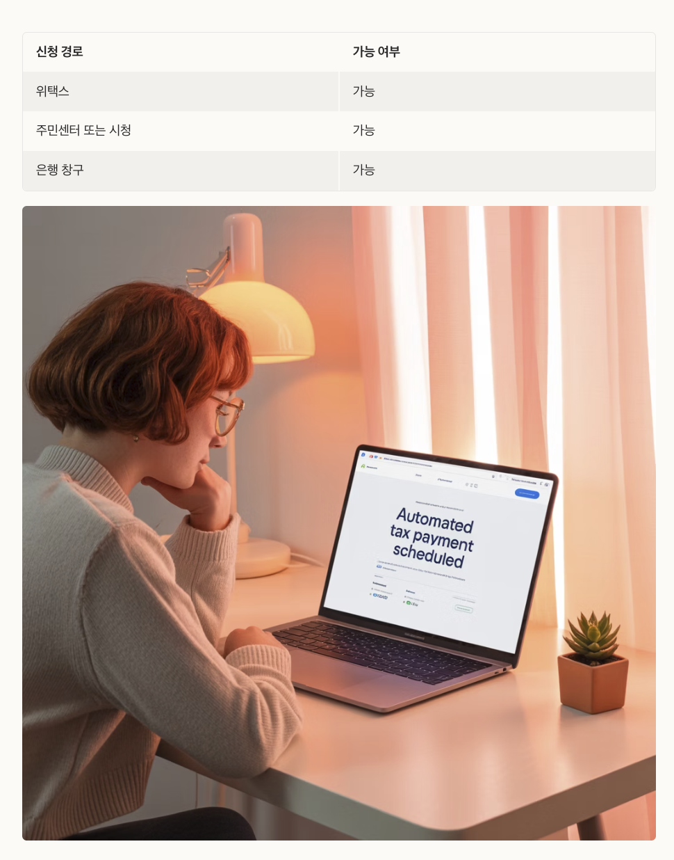 카드 자동이체 또는 계좌 자동이체 모두 가능하며, 은행 창구 또는 위택스에서 신청할 수 있습니다.
