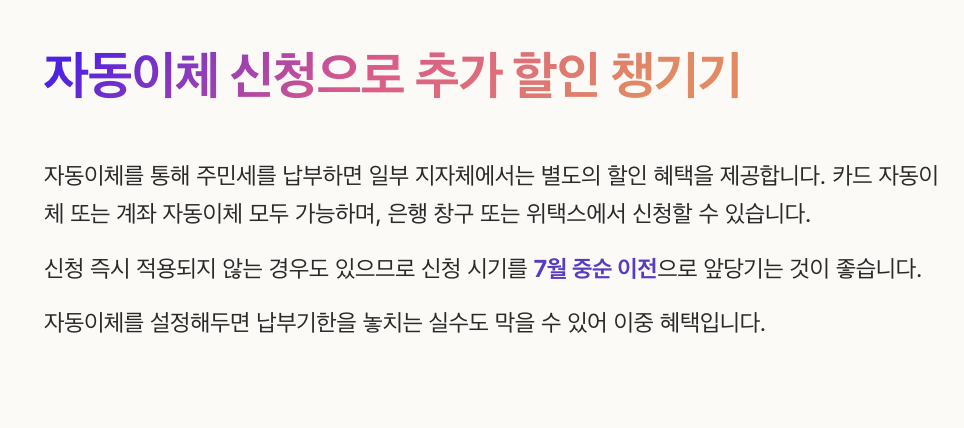 자동이체를 통해 주민세를 납부하면 일부 지자체에서는 별도의 할인 혜택을 제공합니다.