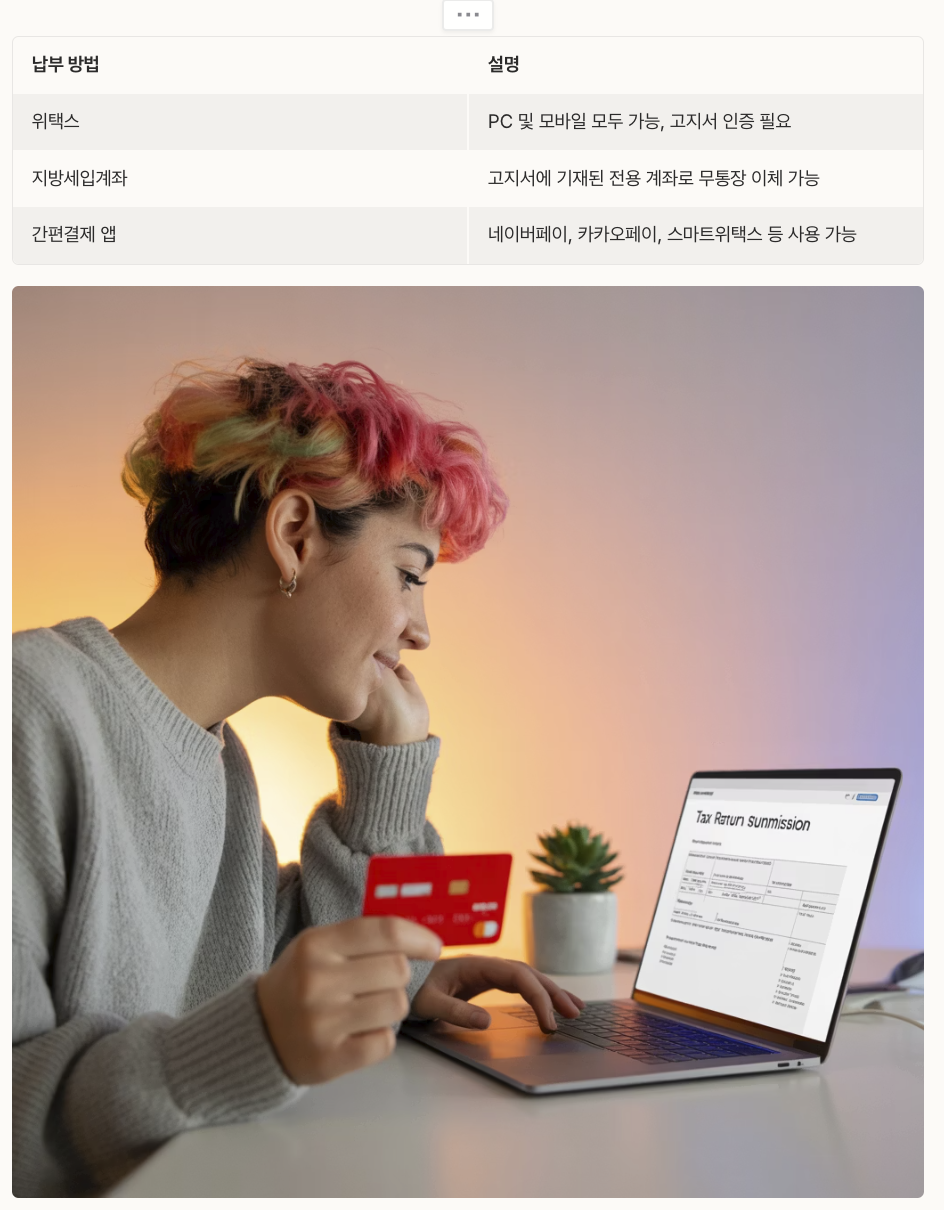 가장 편리한 방법은 위택스를 통한 납부로, 고지서 번호 또는 본인 인증 후