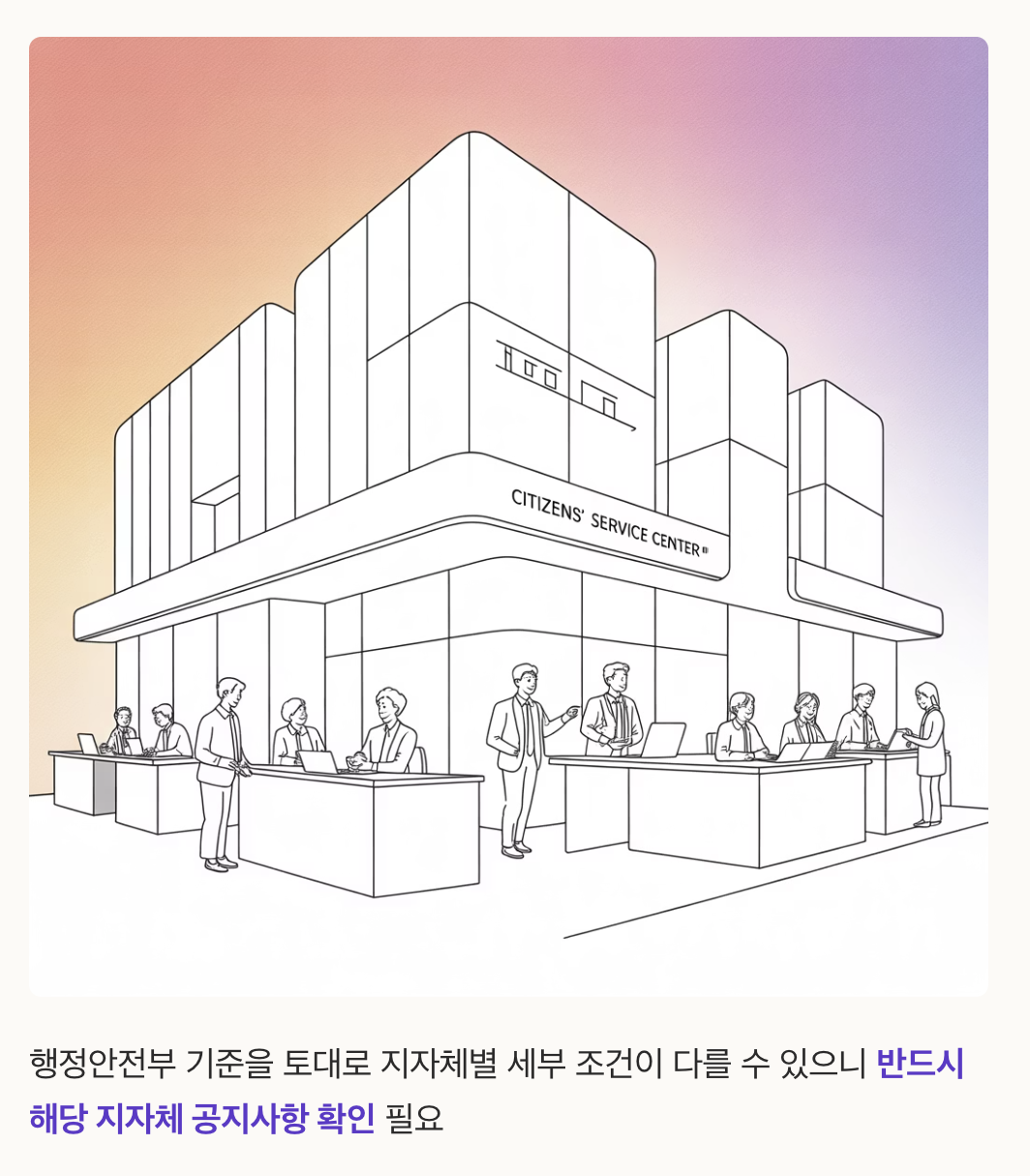 행정안전부가 발표한 기준을 토대로 지자체별로 지급 대상이 정해지다 보니, 일부 지역에서는 세부 조건이 다를 수 있습니다. 반드시 본인이 속한 지자체 공지사항을 통해 최종 조건을 확인하시길 바랍니다.