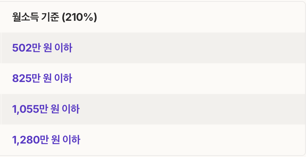 | 가구 소득 | 월 기준 1인 502만 원 ~ 4인 1,280만 원 이하 |