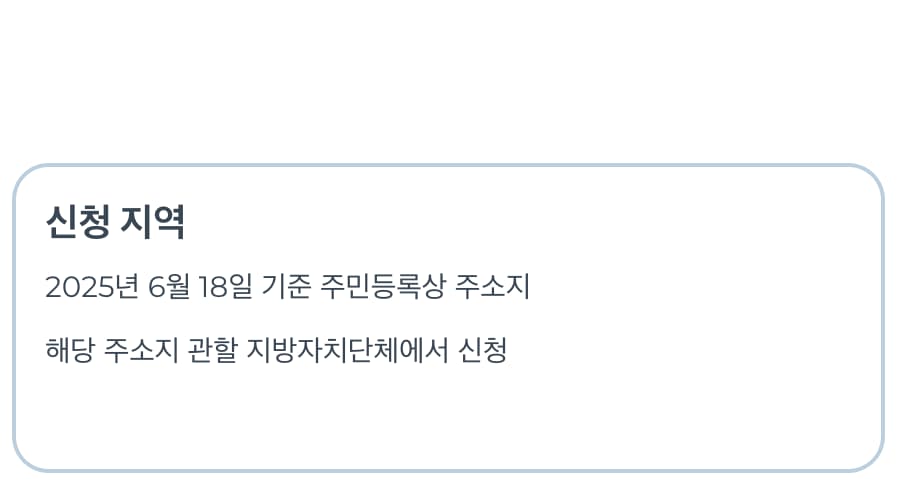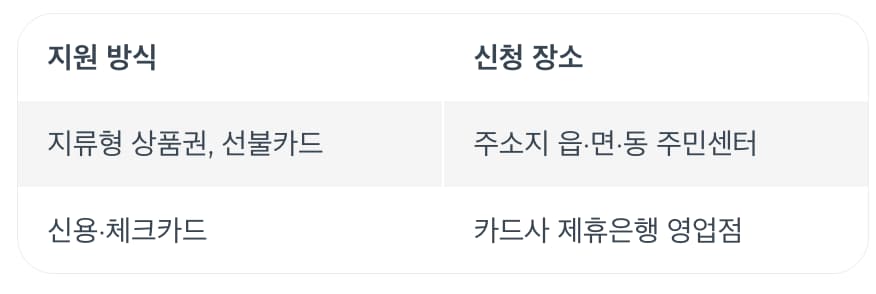 | 오프라인 | 주민센터 또는 은행 방문 → 신청서 작성 및 접수 → 실물 수령 또는 카드 충전 |