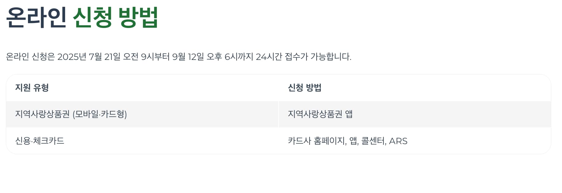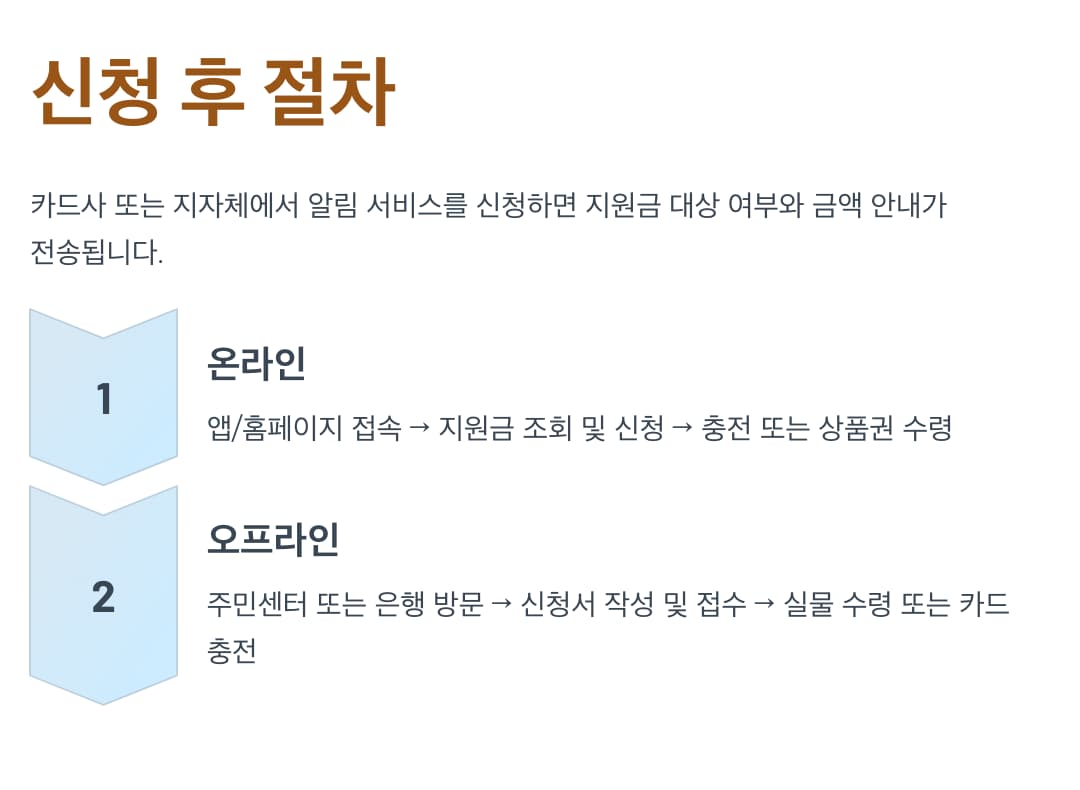 | 온라인 | 앱/홈페이지 접속 → 지원금 조회 및 신청 → 충전 또는 상품권 수령 |