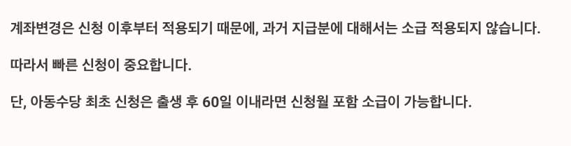단, 아동수당 최초 신청은 출생 후 60일 이내라면 신청월 포함 소급이 가능합니다.