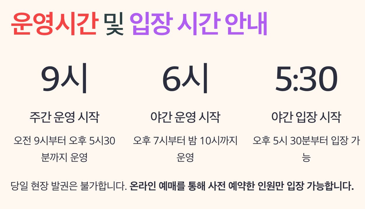 야간 입장은 오후 5시 30분부터 가능하며, 당일 현장 발권은 불가합니다.
