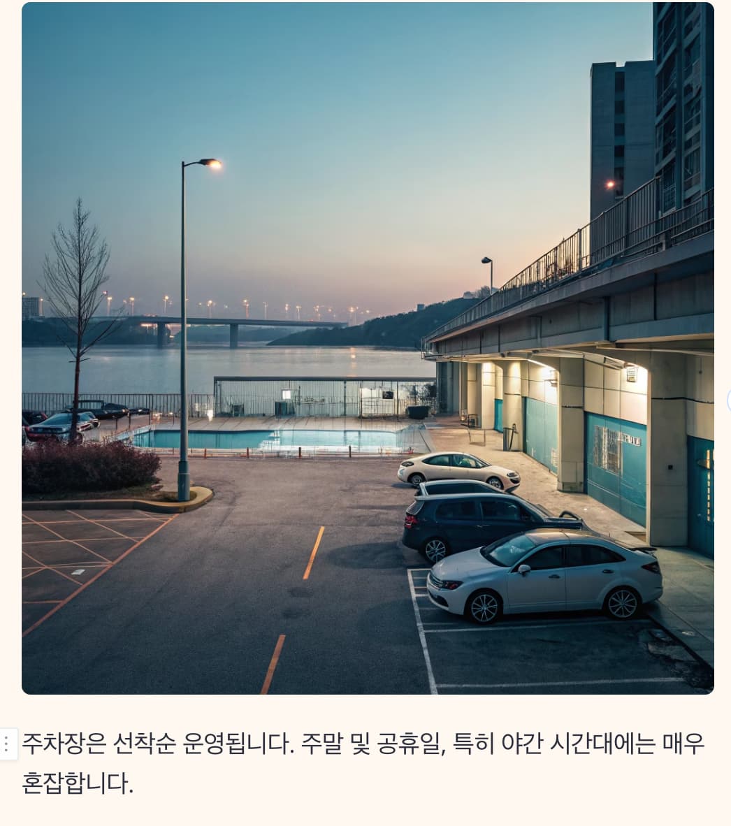 잠원한강공원 내 주차장은 수영장 이용객을 위해 운영됩니다.