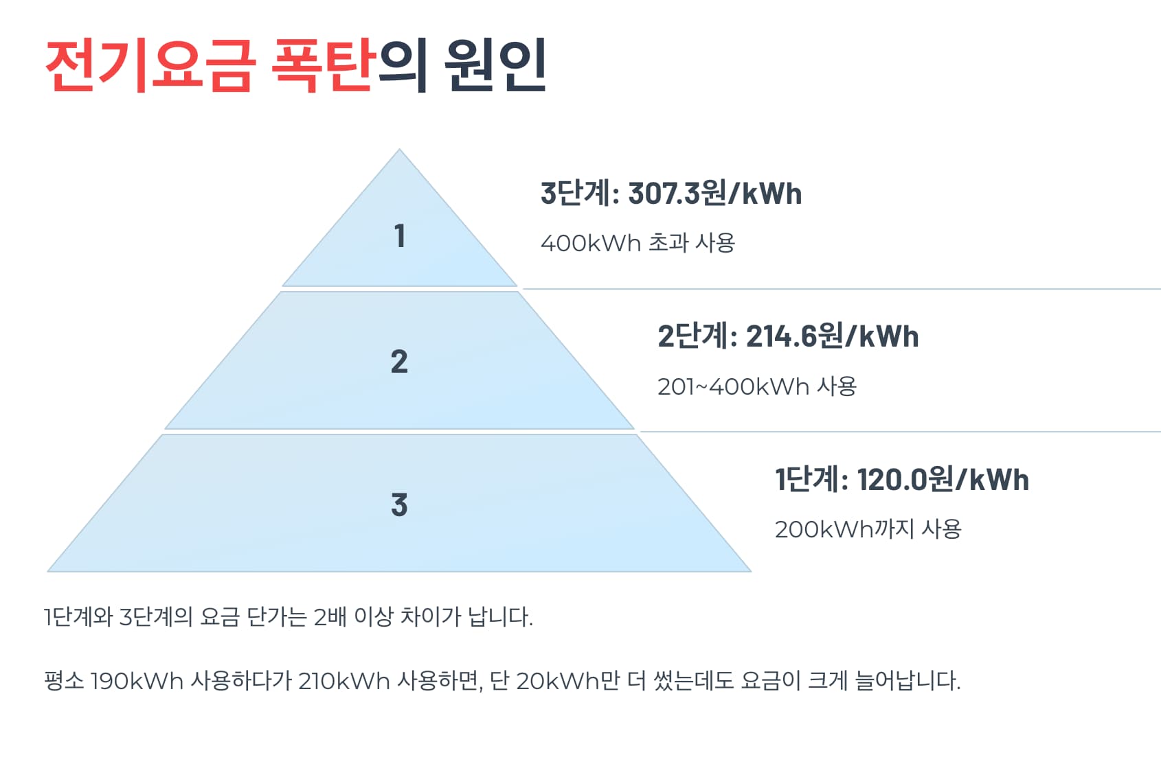 보시면 아시겠지만, 1단계와 3단계의 요금 단가는 2배 이상 차이가 납니다. 예를 들어, 평소 190 kWh를 사용하다가 에어컨 사용으로 210 kWh를 사용하게 되면, 단 20 kWh만 더 썼을 뿐인데 요금 전체 계산 방식이 2단계 단가로 바뀌면서 요금이 크게 늘어날 수 있습니다. 바로 이것이 '전기요금 폭탄'의 주된 이유입니다.