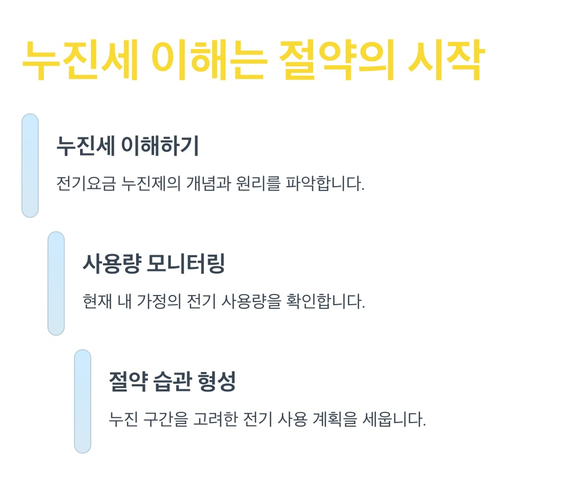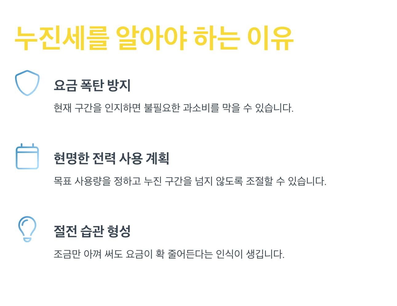 - 절전 습관 형성: 누진제의 원리를 알면 '조금만 더 아껴 써도 요금이 확 줄어든다'는 인식이 생겨 자연스럽게 절전 습관을 형성하게 됩니다.