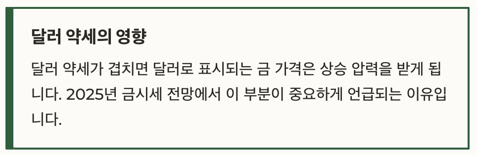 금 가격과 금리는 밀접한 관계를 가집니다. 미국의 금리 인하 기대가 커질수록 실질 금리는 낮아지고, 이 경우 금의 상대적 매력은 높아집니다. 여기에 달러 약세가 겹치면 달러로 표시되는 금 가격은 상승 압력을 받게 됩니다. 2025년 금시세 전망에서 이 부분이 중요하게 언급되는 이유입니다.