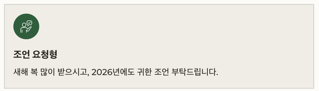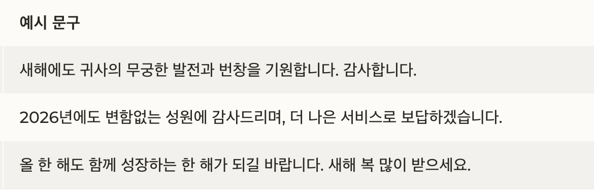 | 고객 대상 메시지 | 2026년에도 변함없는 성원에 감사드리며, 더 나은 서비스로 보답하겠습니다. |