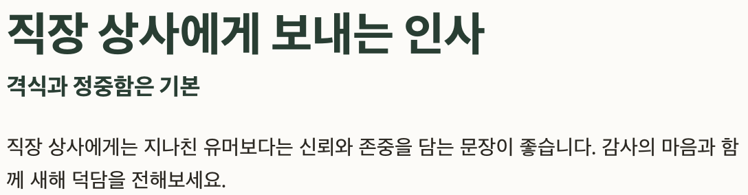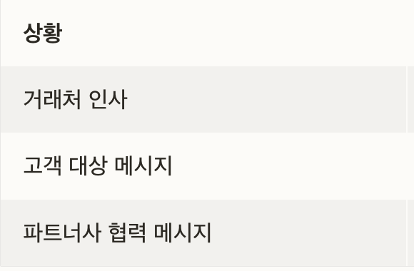 | 거래처·고객사 | 공식적이고 간결한 문장 | 이메일, 카드 |