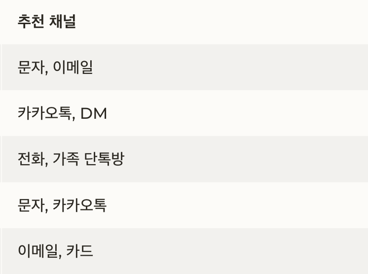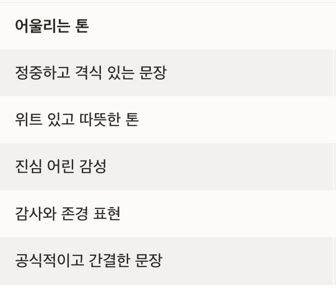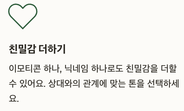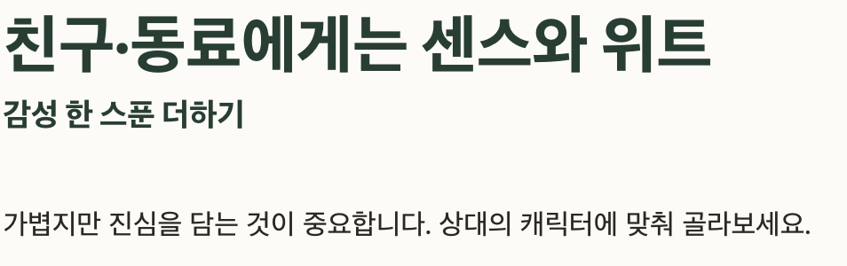 | 친구·동료 | 위트 있고 따뜻한 톤 | 카카오톡, DM |
