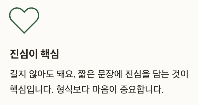 - 길지 않아도 돼요. 짧은 문장에 진심을 담는 것이 핵심입니다.