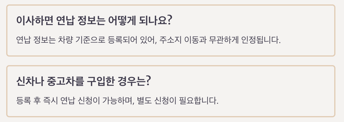 → 정기분은 자동이체 가능하지만, 연납은 반드시 자진 신청해야 합니다. - 이사하면 연납 정보는 어떻게 되나요?