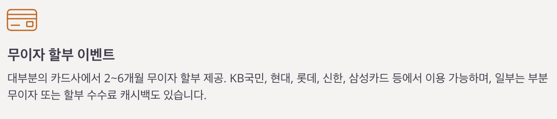 - 일부는 부분 무이자 또는 할부 수수료 캐시백도 있음