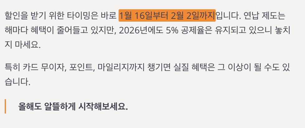 실제 할인은 2월부터 12월까지의 11개월분 세액에만 적용되기 때문에, 실질 할인율은 약 4.58% 수준입니다.