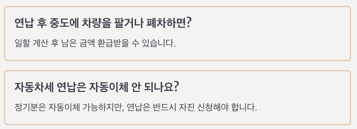 → 일할 계산 후 남은 금액 환급받을 수 있습니다. - 자동차세 연납은 자동이체 안 되나요?