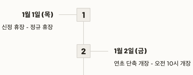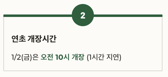 | 연초 개장시간 | 1/2(금)은 오전 10시 개장 (1시간 지연) |