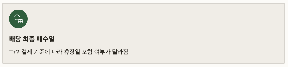 - 배당 받기 위한 최종 매수일: T+2 결제 기준에 따라 휴장일 포함 여부가 달라짐
