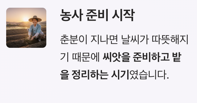 춘분이 지나면 날씨가 따뜻해지기 때문에 씨앗을 준비하고 밭을 정리하는 시기였습니다.