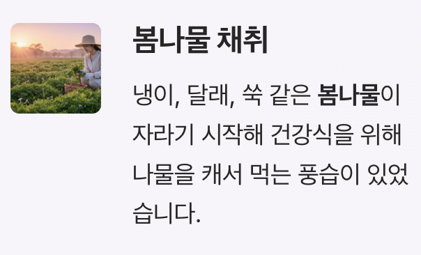이 시기에는 냉이, 달래, 쑥 같은 봄나물이 많이 자라기 시작합니다. 그래서 봄철 건강식을 위해 나물을 캐서 먹는 풍습이 있었습니다.