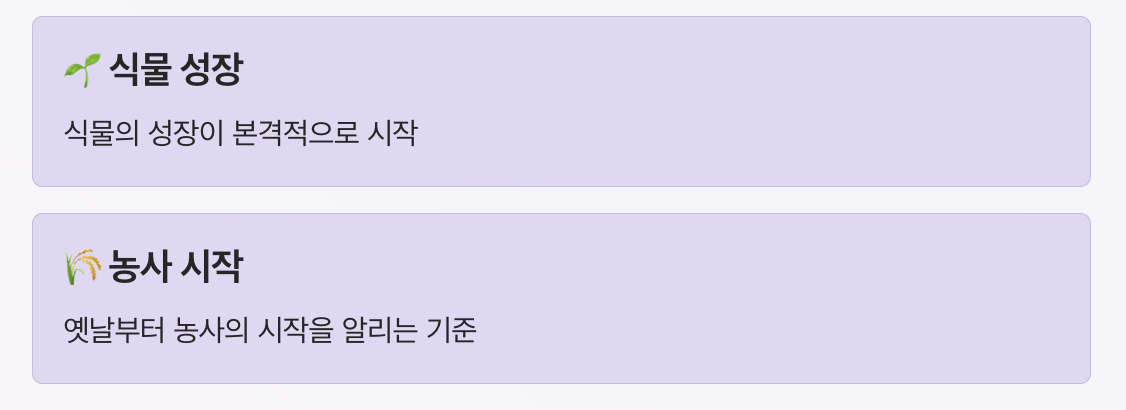 | 절기 의미 | 본격적인 봄의 시작 |