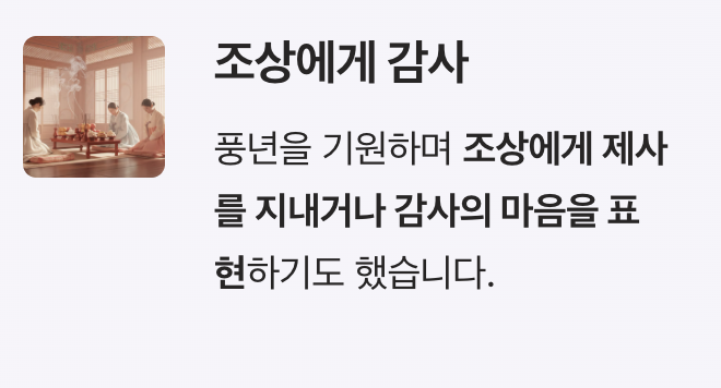 풍년을 기원하며 조상에게 제사를 지내거나 감사의 마음을 표현하기도 했습니다.