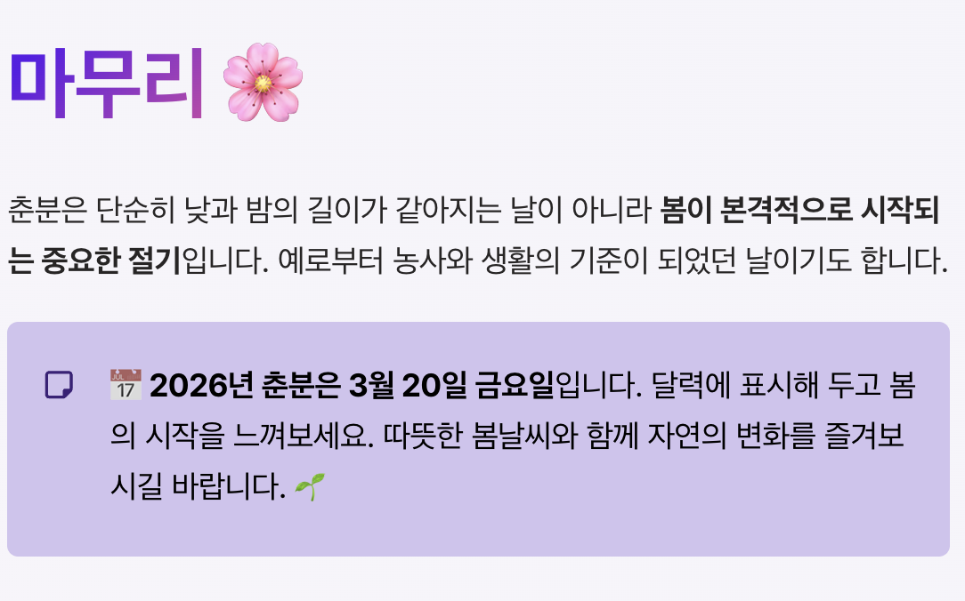 2026년 춘분은 3월 20일 금요일이니 달력에 표시해 두고 봄의 시작을 느껴보는 것도 좋겠습니다. 따뜻한 봄날씨와 함께 자연의 변화를 즐겨보시길 바랍니다. 🌸