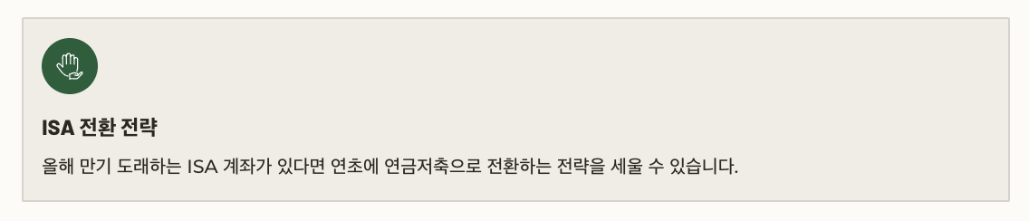 게다가 올해 만기 도래하는 ISA 계좌가 있다면 연초에 연금저축으로 전환하는 전략까지 세울 수 있습니다.