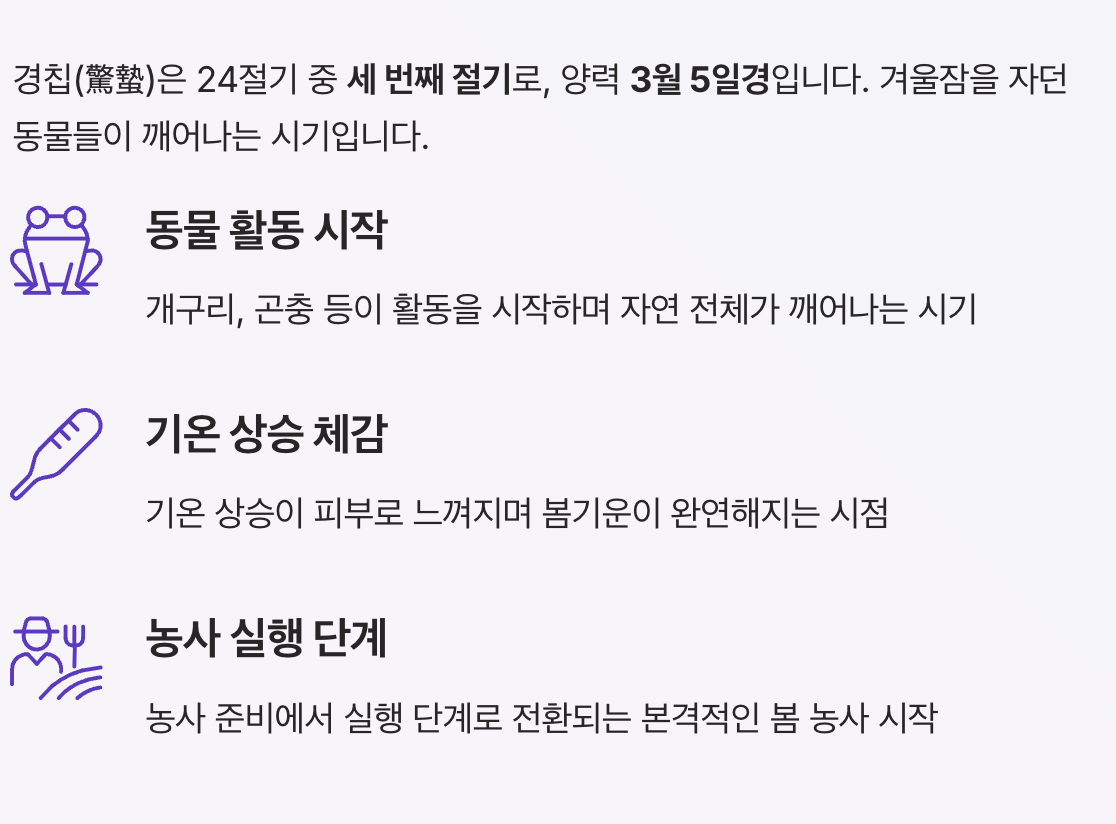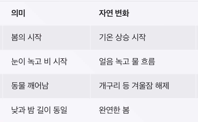 | 경칩 | 3월 5일경 | 동물 깨어남 | 개구리 등 겨울잠 해제 | 봄 농사 본격화 |