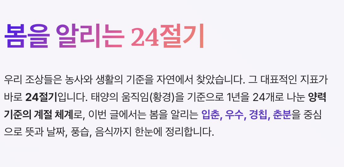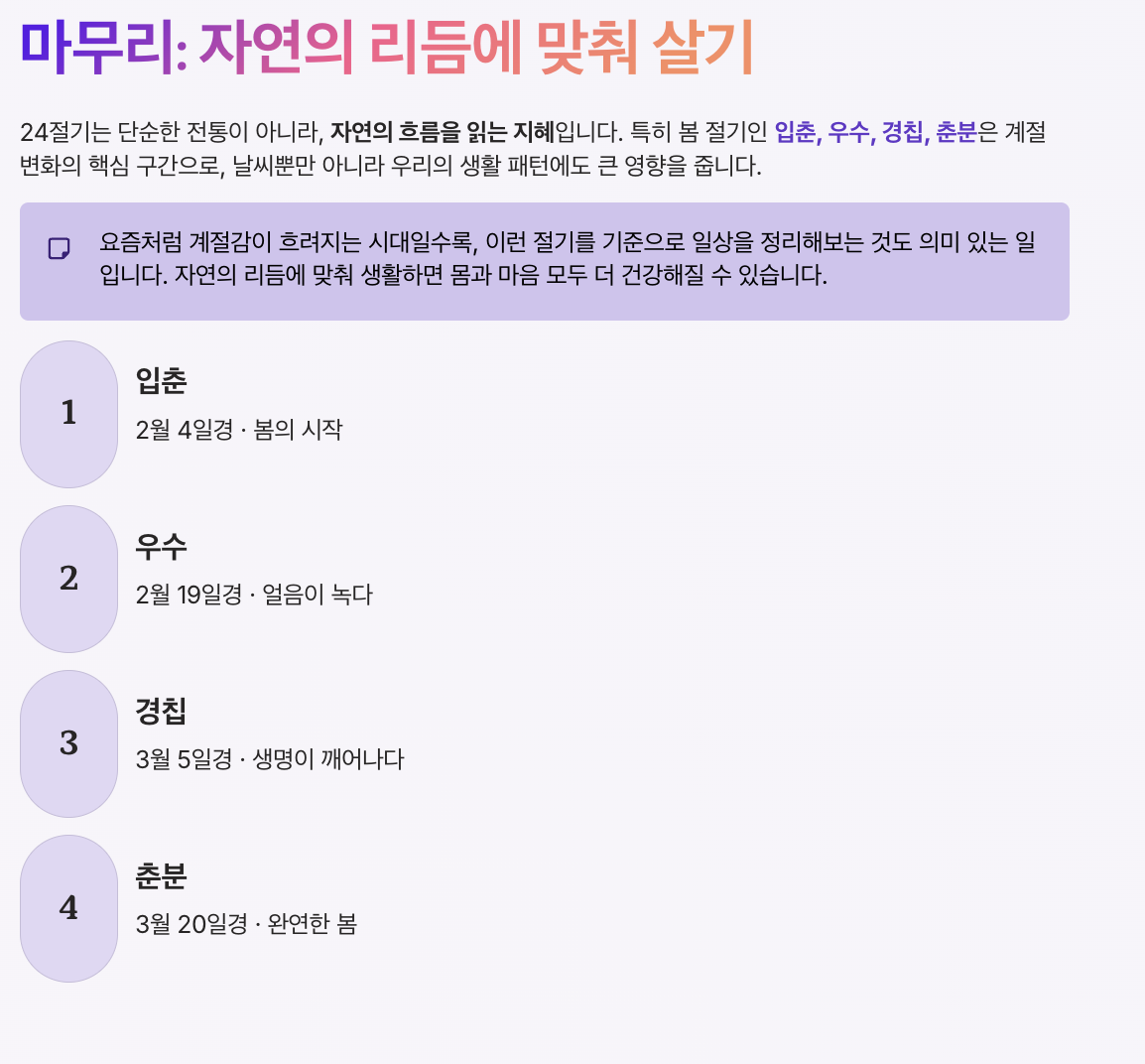 24절기는 단순한 전통이 아니라, 자연의 흐름을 읽는 지혜입니다. 특히 봄 절기인 입춘, 우수, 경칩, 춘분은 계절 변화의 핵심 구간으로, 날씨뿐만 아니라 우리의 생활 패턴에도 큰 영향을 줍니다.