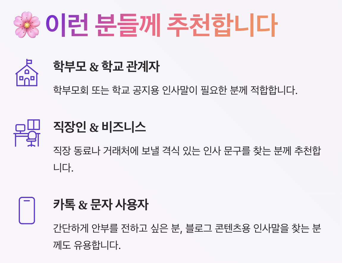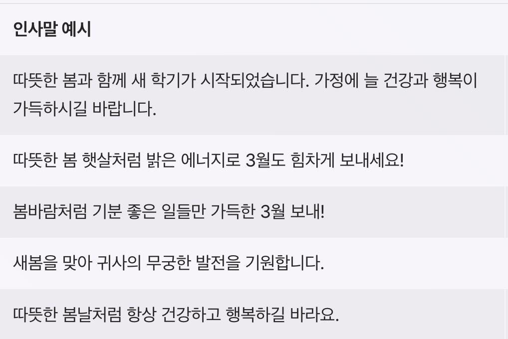 | 학부모 대상 | 따뜻한 봄과 함께 새 학기가 시작되었습니다. 가정에 늘 건강과 행복이 가득하시길 바랍니다. | 공식적이고 부드러운 톤 |