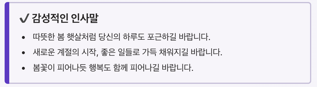 아래 표는 다양한 관계에서 활용할 수 있는 봄 인사말을 정리한 것입니다.